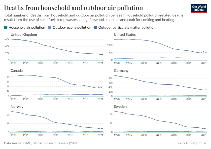 In 2021, this totaled around 8 million deaths. Note that there are also natural sources of particulate matter, so not all of these pollution deaths resulted from human emissions. But most did. For more on this, see our colleague Max Roser’s article, which looks at estimates from various sources.