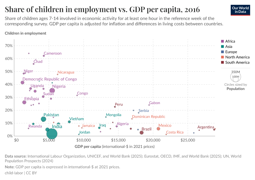 The visualization depicts the cross-country incidence of child labor (share of children aged 7-14 involved in economic activity) against GDP per capita. To provide some context regarding the absolute number of children, each country's observation is pictured as a circle where the size of the circle represents the population aged 5-14.