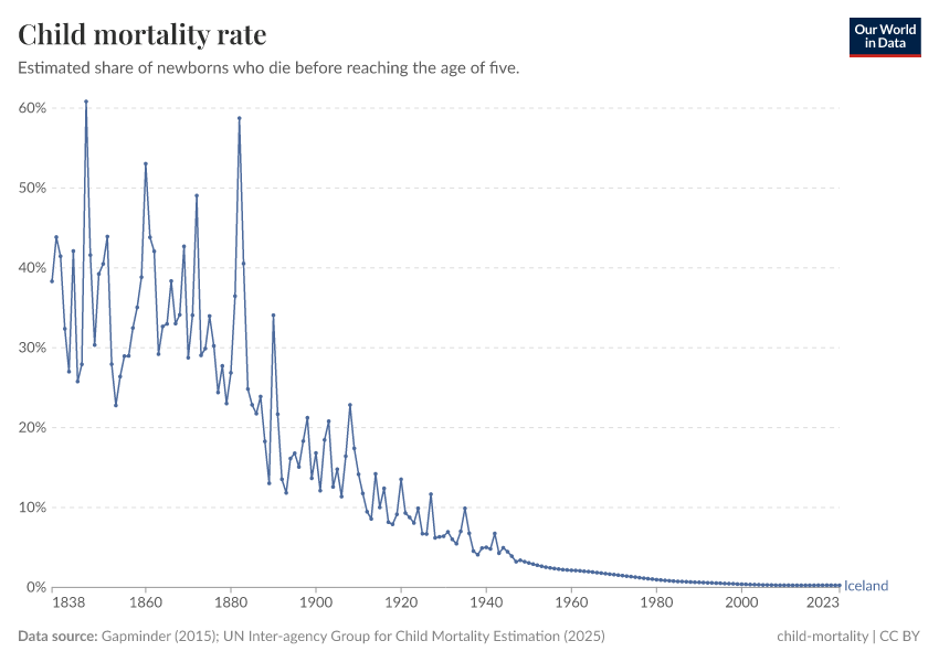 The global inequality we see today is the consequence of unequal progress. Even in today’s healthiest and wealthiest countries, the low child mortality rates are a very recent achievement: the chart shows the decline of child mortality in the country that has the lowest child mortality today. In the 19th century around a third of all children in Iceland died (a much higher rate than in today’s worst-off countries). Good child health is the consequence of the progress achieved in the country’s modern history.