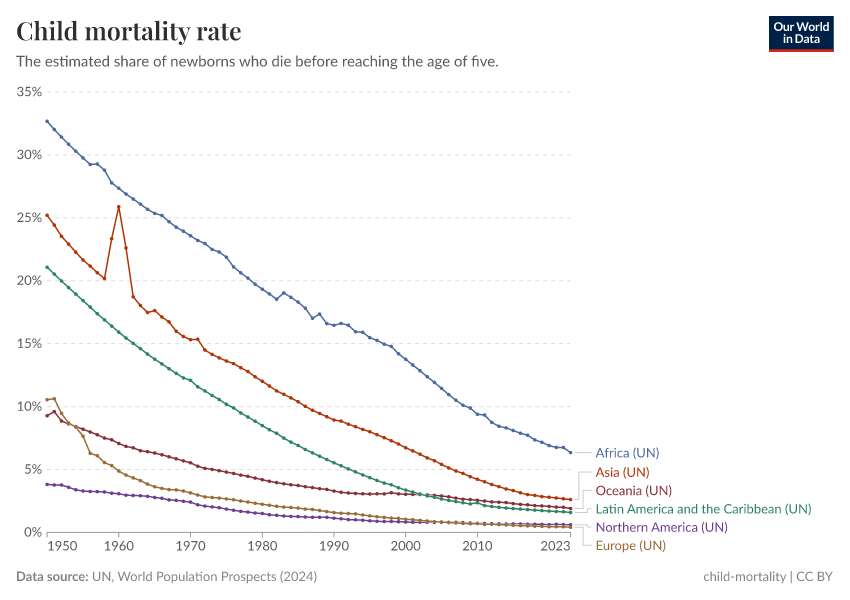 But 1950 was also a divided world. Child mortality rates across the rest of the world were still unimaginably high. With one-in-three children (sometimes higher) dying in their first few years, most parents across Africa, Asia and much of South America were probably still losing several children.