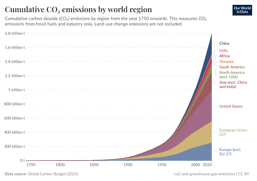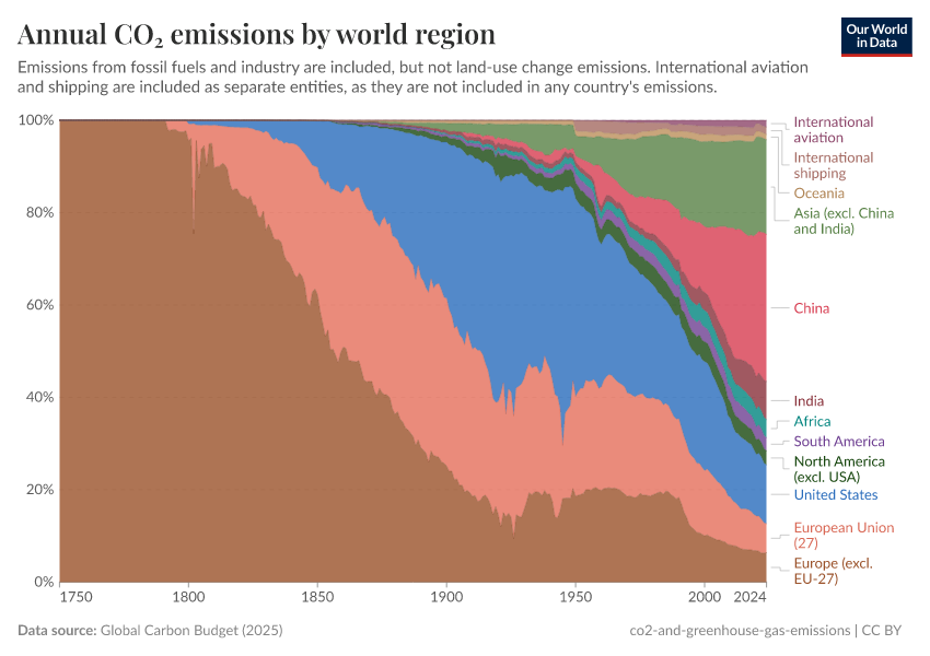 In the following chart, we see the change in the share of global cumulative emissions by region over time from 1751.