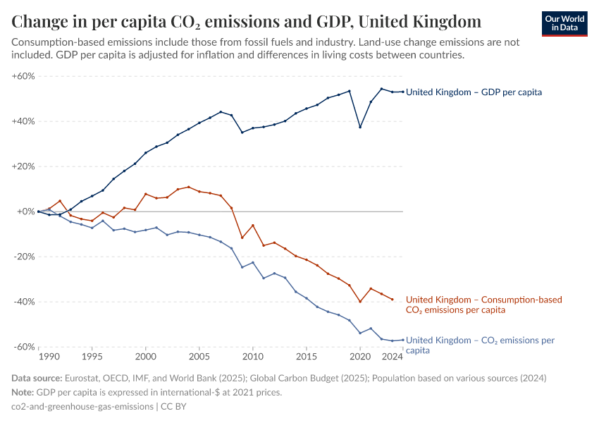 Take the UK as an example. It is shown in the chart. This chart shows the change in GDP and annual CO2 emissions per capita since 1990. We see that the UK’s GDP has increased a lot over the last 30 years while its emissions have fallen. You can also see the data without per capita adjustments.