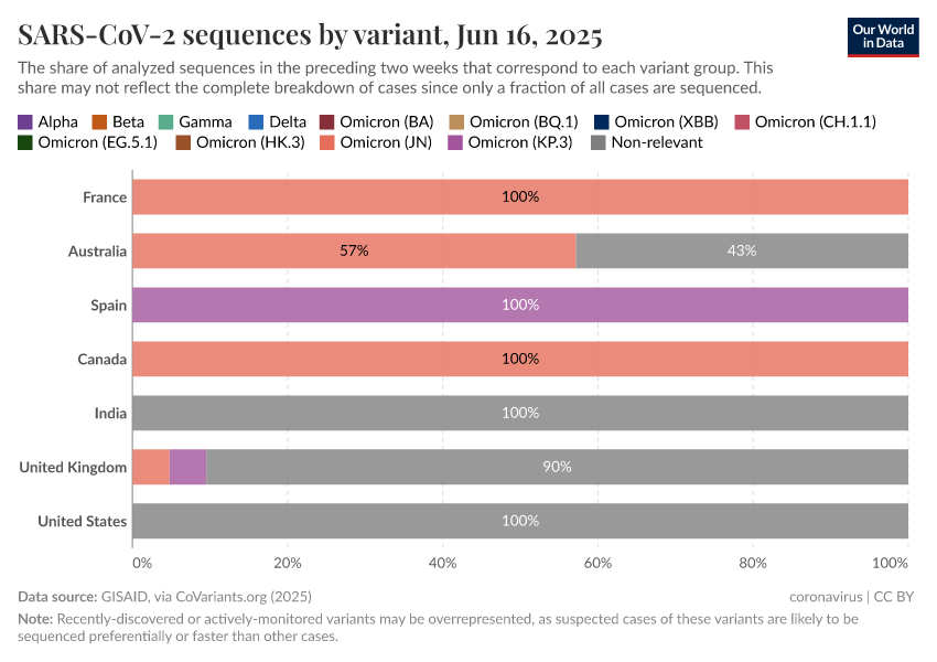 We obtain the share of cases of each variant by dividing the number of sequences labeled for that variant by the total number of sequences. Since only a fraction of all cases have their genome sequenced, this share may not reflect the complete breakdown of cases.