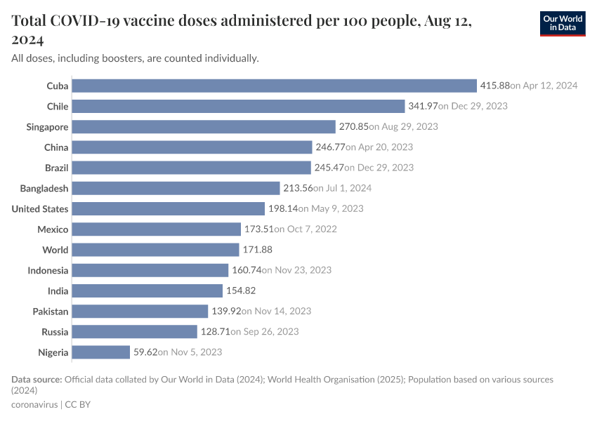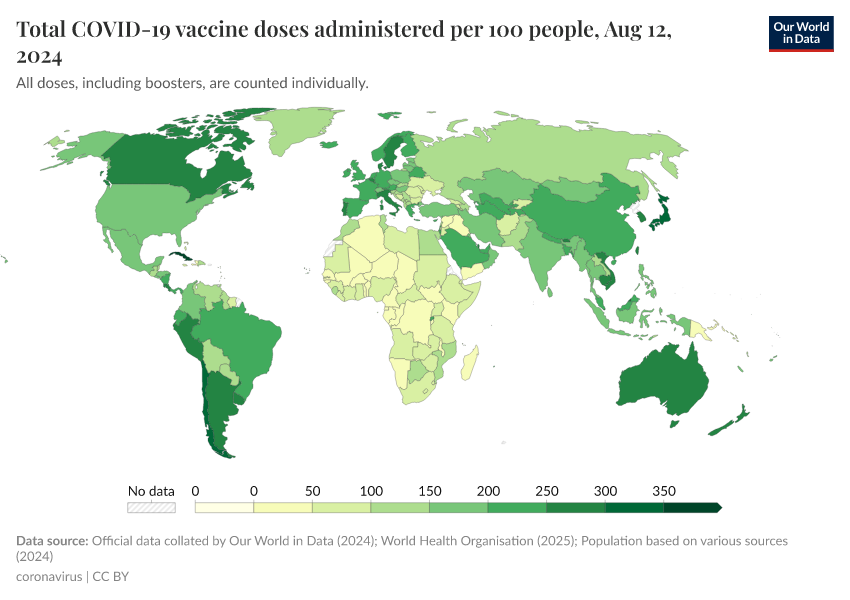 The following map and chart show the number of vaccine doses administered per 100 people within a given population. Each dose, including boosters, is counted as an individual dose.
