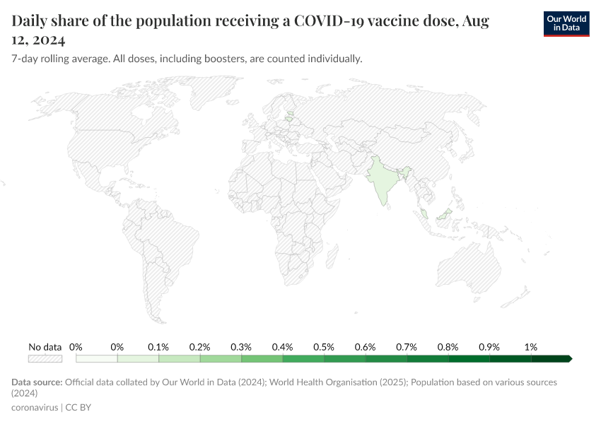 The following chart shows the share of people receiving a COVID-19 vaccine dose. This is shown as a seven-day rolling average.