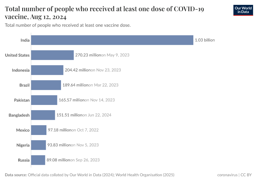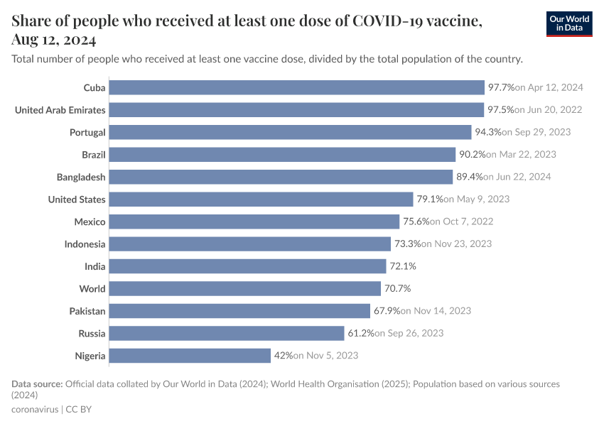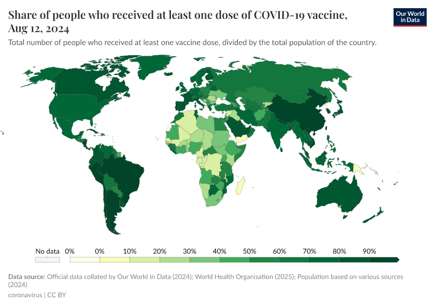Edouard Mathieu, Hannah Ritchie, Lucas Rodés-Guirao, Cameron Appel, Daniel Gavrilov, Charlie Giattino, Joe Hasell, Bobbie Macdonald, Saloni Dattani, Diana Beltekian, Esteban Ortiz-Ospina, and Max Roser (2020) - “Coronavirus (COVID-19) Vaccinations” Published online at OurWorldinData.org. Retrieved from: 'https://enhance-improve-who-empower.owid.pages.dev/covid-vaccinations' [Online Resource]BibTeX citation