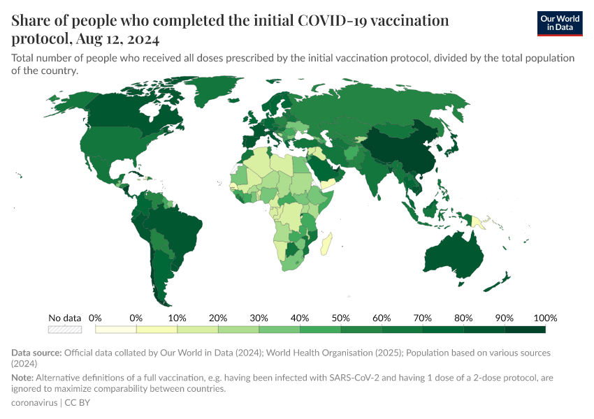 The following chart shows the share of the total population that has completed the initial vaccination protocol.