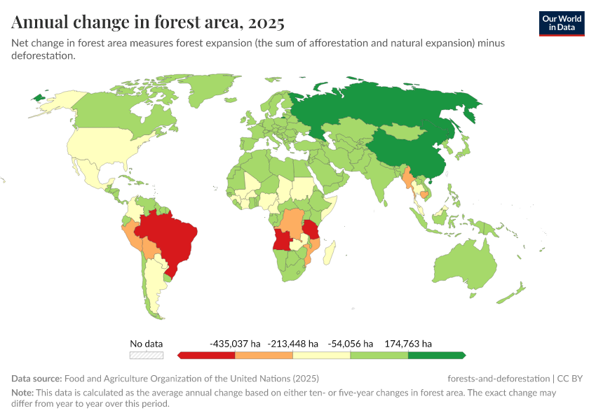 Data on net forest change, afforestation, and deforestation is sourced from the UN Food and Agriculture Organization's Forest Resources Assessment. Since year-to-year changes in forest cover can be volatile, the UN FAO provides this annual data averaged over five-year periods.