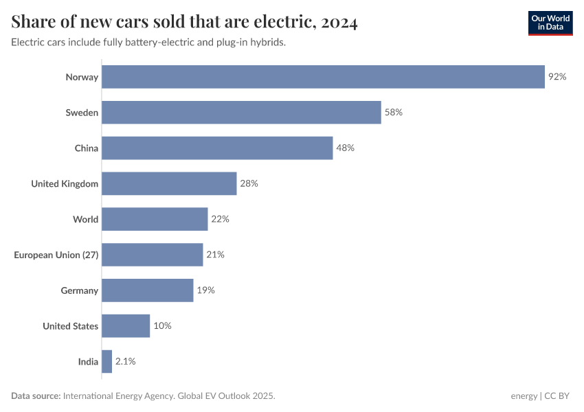 Globally, around 1-in-5 new cars sold were electric in 2023.3 This share was over 90% in Norway, and in China, it was almost 40%.