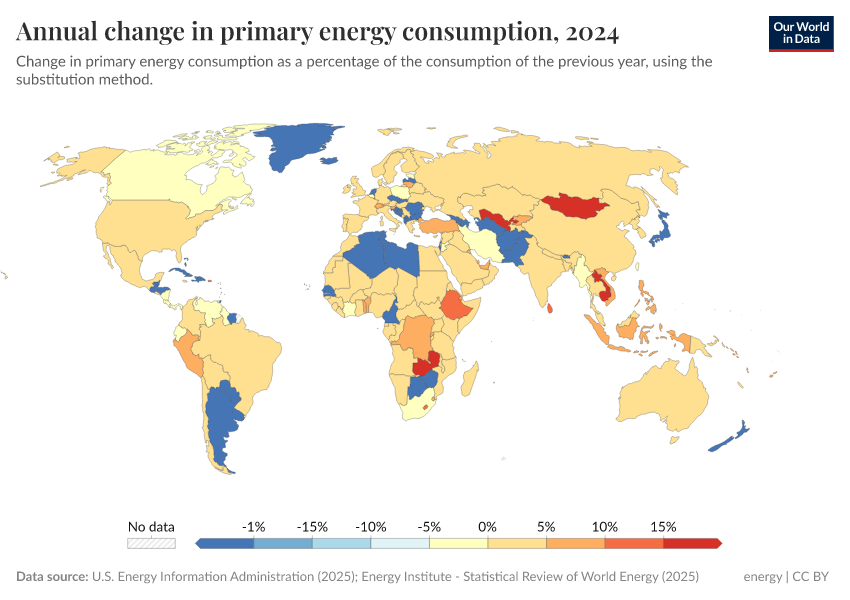 This interactive chart shows the annual growth rate of energy consumption. Positive values indicate a country's energy consumption was higher than the previous year. Negative values indicate its energy consumption was lower than the previous year.