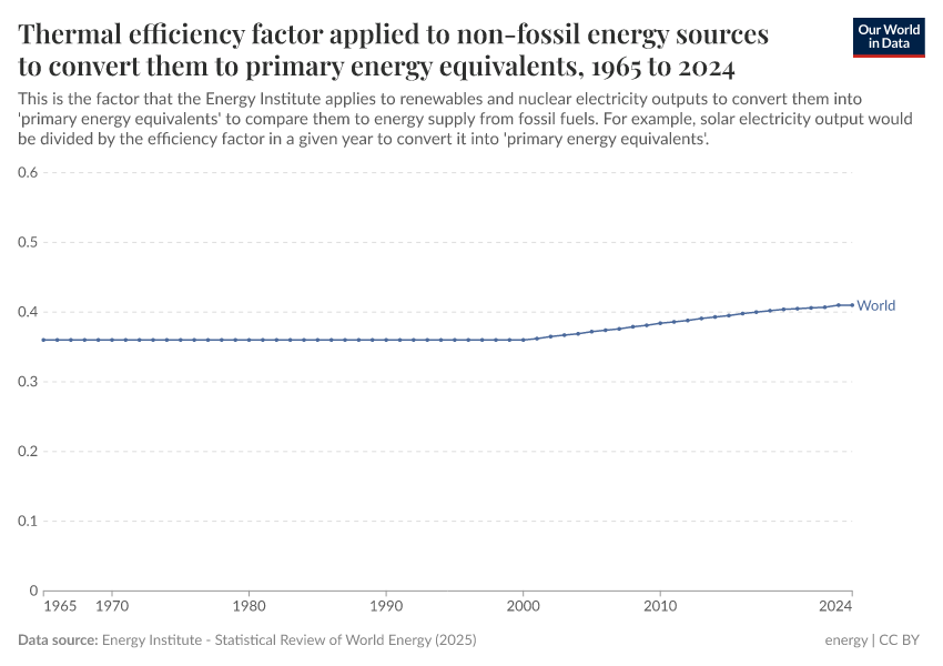 This adjustment is fairly crude. Non-fossil electricity generation is divided by a ‘thermal efficiency factor’, which is the average efficiency of fossil electricity. In the chart, we see the factor that the Energy Institute applies. This factor has changed over time due to changes in the composition of the fossil fuel mix (the split between coal and gas), and efficiency improvements in power plants over time.