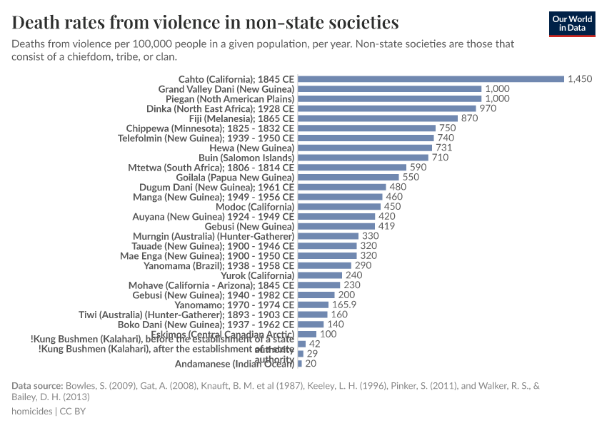 - Sources that my source quoted: For a first time period (1940-62) Knauft (1985) - Good company and violence: Sorcery and social action in a lowland New Guinea society. Berkeley:University of California Press. cites 778 violent deaths per 100,000 people per year. For a second time period (1959-68): Steadman (1971) - Neighbors and killers: Residence and dominance among the Hewa of New Guinea. Ph.D. diss., Australian National University, Canberra, Australia. cites 683 violent deaths per 100,000 people per year. I calculated the mean which is 731.