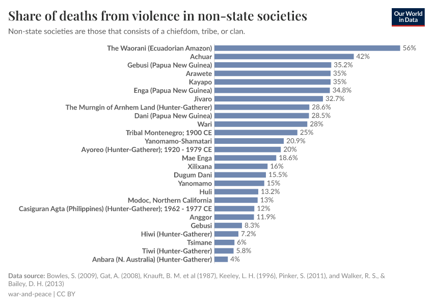 - Comment and Source that my source quotes: Gat (2006) quotes death rates from Pilling and Kimber and refers to three different sources: Warner, A Black Civilization, pp. 157–8; Pilling, in Man the Hunter, p. 158; R. G. Kimber, ‘Hunter-gatherer demography: The recent past in Central Australia’, in B. Meehan and N. White (eds), Hunter-Gatherer Demography. Sydney: University of Sydney, 1990, p. 163.Gat (2006) refers to Pilling saying: 'Pilling’s estimate of at least 10 per cent killed among the Tiwi men in one decade.'Gat (2006) refers to Kimber saying: 'Kimber’s estimate, for a generation, of 5 per cent mortality in fighting in arid areas and about 6.5 per cent in well-watered ones refers to violent mortality in relation to the entire population’s overall mortality rates.' Pinker quotes the 10%, which according to Gat (2006) only refers to the male population. I decided to quote the average of the two shares specified for the entire population. That is 5.75%.