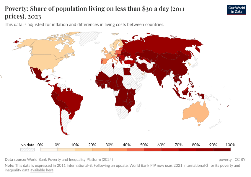 Remember that these statistics take the cost of living into account – a person who lives on less than int-$30 is a person who cannot afford the goods and services that cost US-$30 in the US.