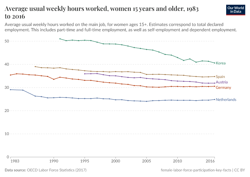 The chart here provides some clues. It shows several decades of changing average weekly hours worked for women in a selection of OECD countries. As we can see, most countries show negative trends, which is consistent with the trends for the population as a whole. However, some of these trends are still remarkable if we take into account the substantial increase in female participation taking place at the same time.