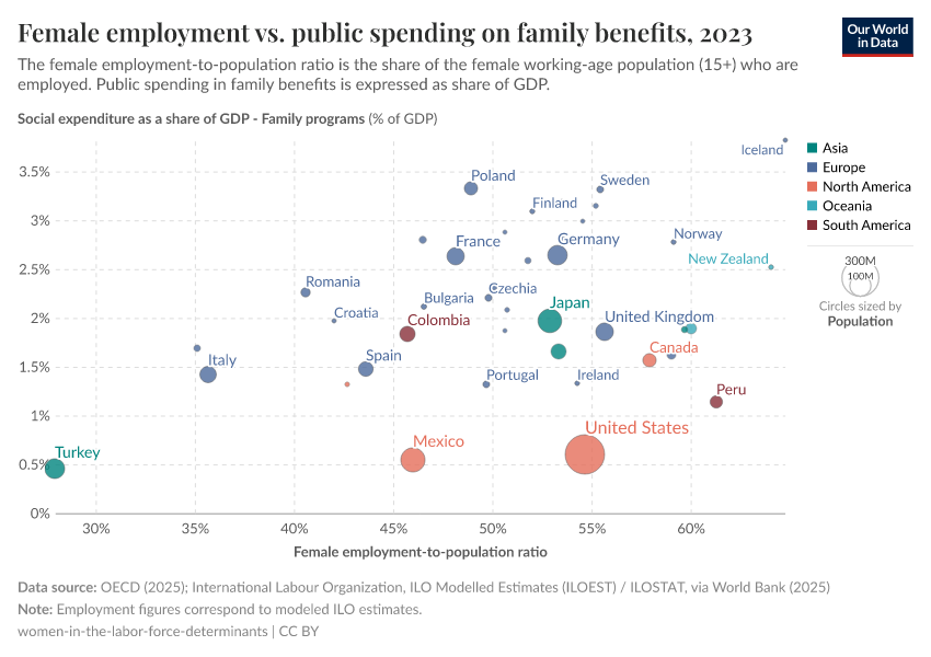 In the chart here, we show that female employment, measured as the employment-to-population ratios for women 15+, tends to be higher in countries with higher levels of public spending on family benefits (i.e. child-related cash transfers to families with children, public spending on services for families with children, and financial support for families provided through the tax system, including tax exemptions).