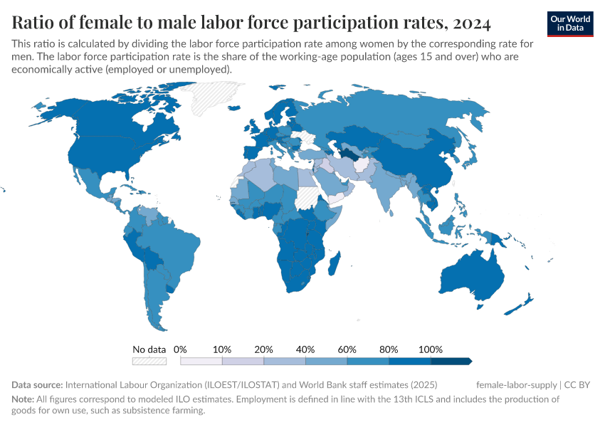 The map here provides a picture of how men and women compare today in terms of participation in labor markets, country by country. Shown is the female-to-male ratio in labor force participation rates (expressed in percent). These figures show estimates from the International Labor Organization (ILO). These are 'modeled estimates' in the sense that the ILO produces them after harmonizing various data sources to improve comparability across countries.