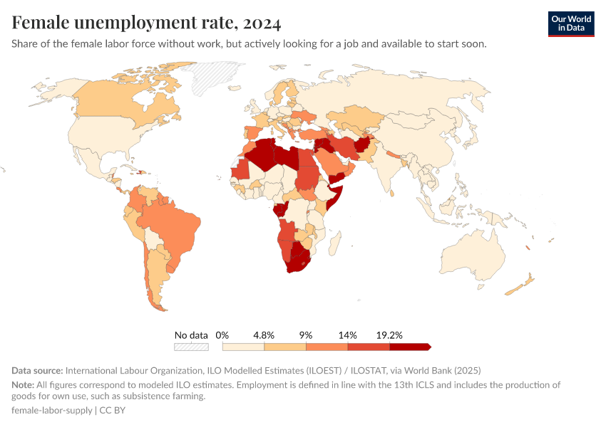 The map shows unemployment rates for women across the world. As we can see, the highest female unemployment rates correspond to the countries with the lowest female labor force participation, notably in North Africa and the Middle East.