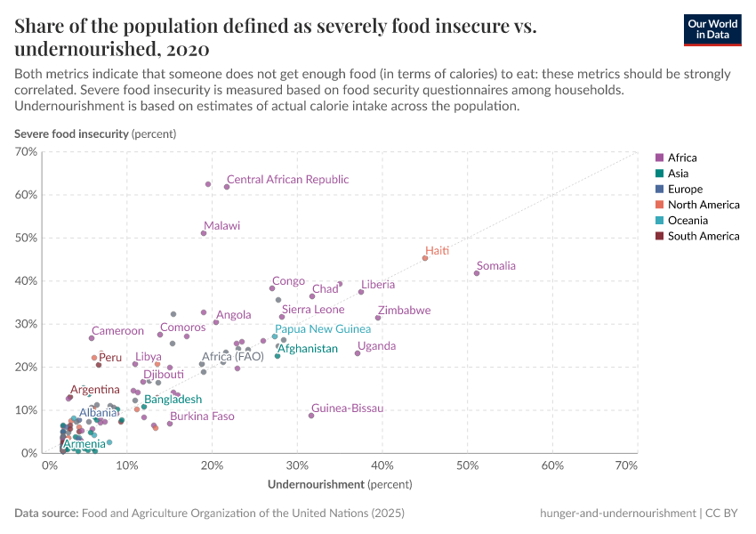 In the chart below we see the correlation between these two metrics: on the y-axis we have the prevalence of severe food insecurity, and on the x-axis we have the prevalence of undernourishment. If these estimates were identical, they’d lie along the diagonal gray line.