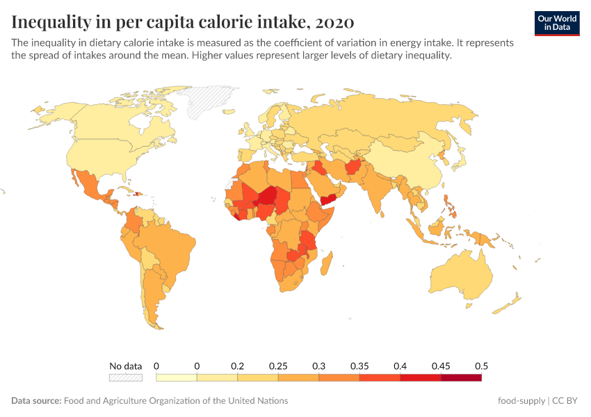 In the map, you can see a diverse range of values representing dietary inequality, with Sub-Saharan Africa standing out as a region where it tends to be most pronounced. The values have shown a consistent pattern over the past few decades, characterized by minor year-to-year fluctuations.