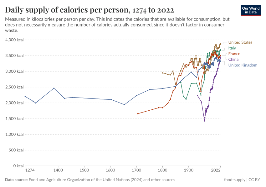 As productivity increased, famines and the exclusion of the poor due to hunger and too little energy became a thing of the past in both France and England. The improving supply of food in both countries is shown in the visualization below. In terms of calories, the average food supply in France more than doubled over the last 300 years.1.