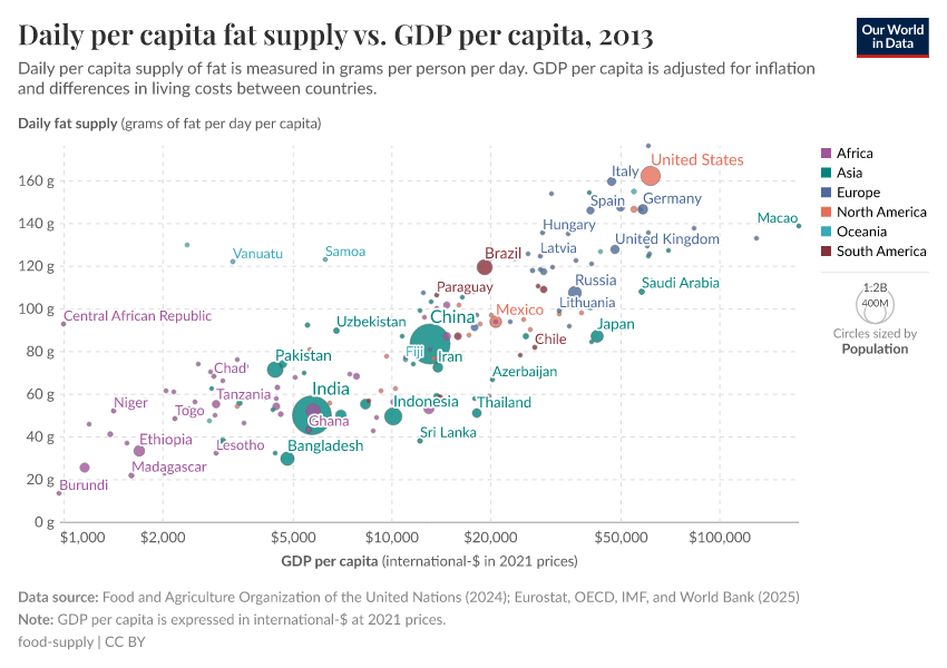 In this interactive map, we see the differences in how much fat each person gets every day in different countries.