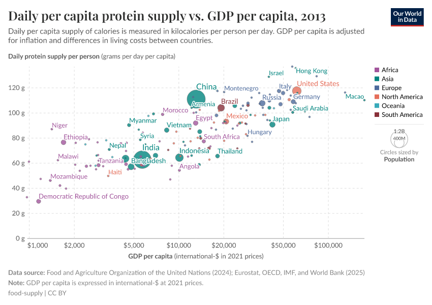 In the sub-sections below we have plotted the relationship between daily per capita food supply (in the form of calories, protein, and then fat) versus gross domestic product (GDP) per capita in 2011 international-$. Several countries selected across a range of income levels and global regions have been highlighted for comparison. For all three measures of food supply, we see a close correlation between per capita supply and prosperity. As we get richer, per capita supply tends to increase.