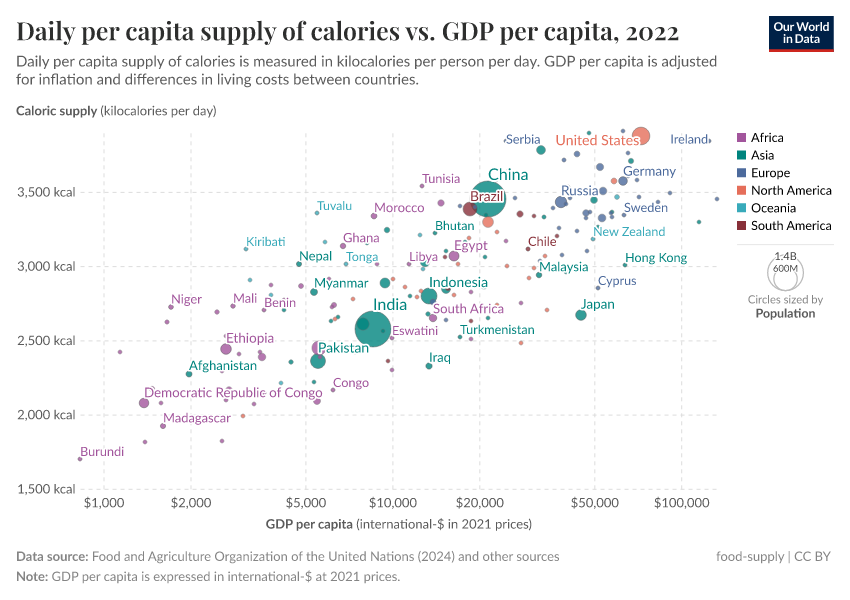 Per capita food supply therefore tends to increase with economic growth. However, this trend tends to taper off or even reverse in high-income countries.