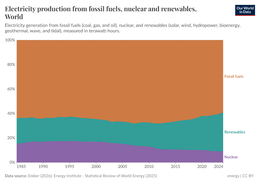 In the chart here we see trends in electricity production2 from renewable technologies, nuclear, and fossil fuels. These figures are given as the percentage contribution to total global electricity production.