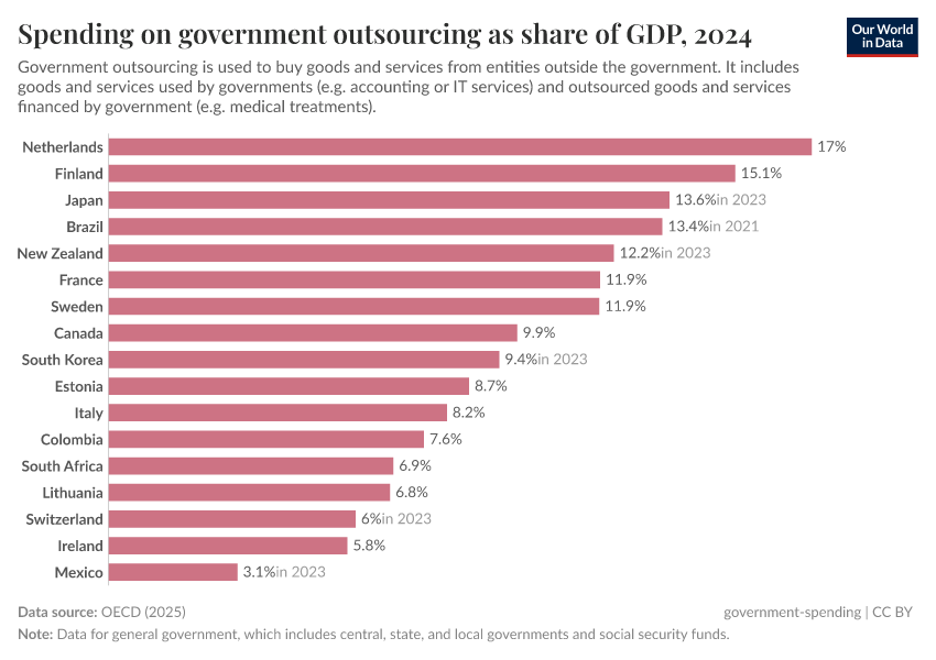 As we can see, governments in many high-income countries spend substantial resources via outsourcing.