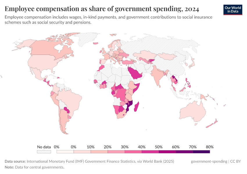 The next chart shows the share of central government expenditure that goes to the compensation of government employees. Compensation of employees includes all salaries and benefits (both in cash and in-kind).