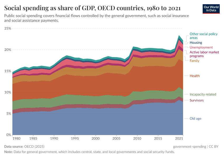 The chart above shows that government spending in early-industrialized countries grew substantially in the 20th century. The next visualization shows that this was the result of growth, specifically in social spending.