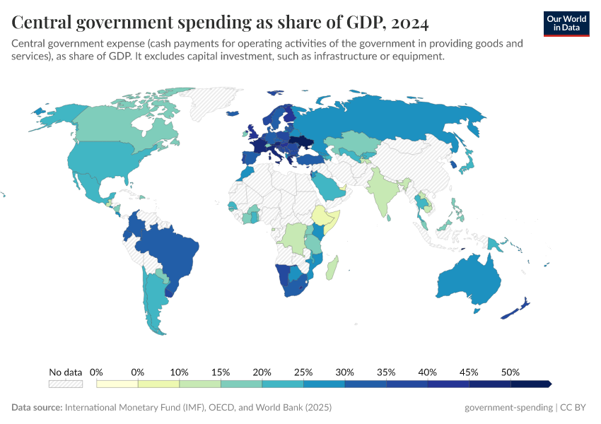 The next chart maps recent estimates of central government expenditure, as a share of national output, across the world. The data is published as part of the World Development Indicators and comes from the International Monetary Fund.