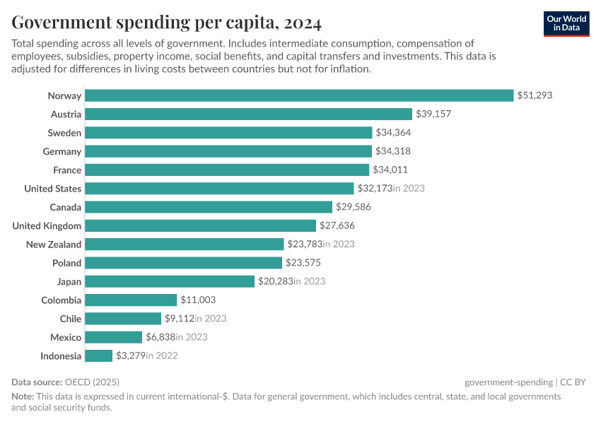 The chart shows total public spending per person across all levels of government in OECD countries. To allow for cross-country comparability, these estimates are expressed in current international dollars — a metric that adjusts for differences in living costs between countries.