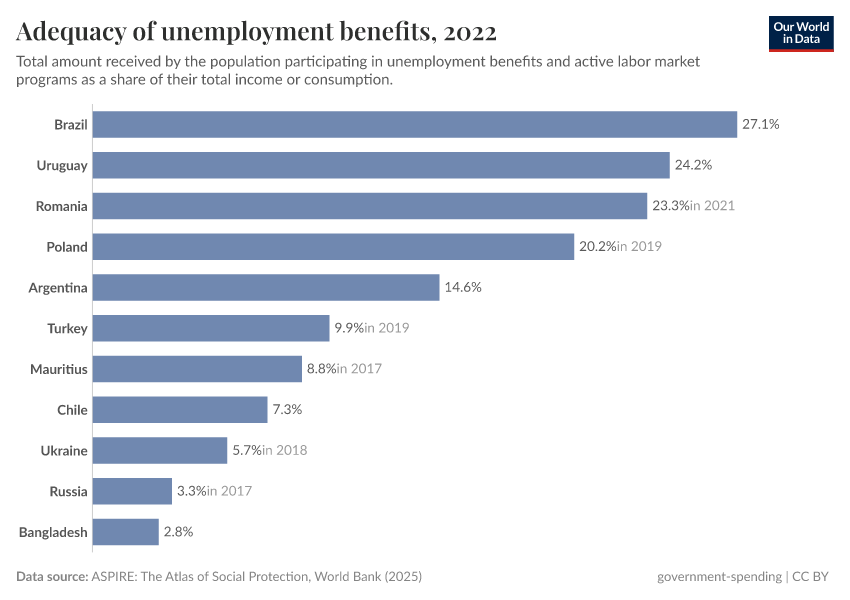 “Data Page: Adequacy of unemployment benefits”. Our World in Data (2025). Data adapted from World Bank. Retrieved from https://enhance-improve-who-empower.owid.pages.dev/grapher/adequacy-of-unemployment-benefits [online resource]How to cite this data