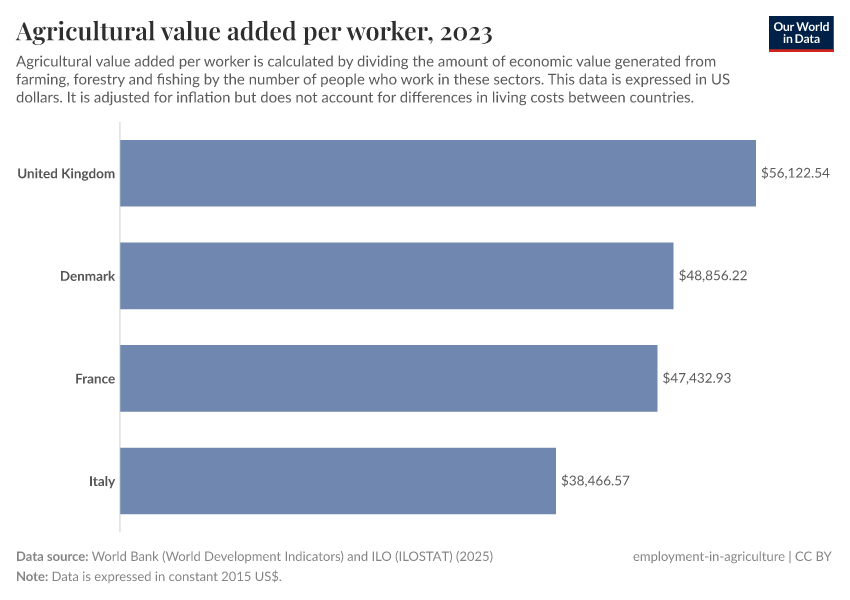 “Data Page: Agricultural value added per worker”. Our World in Data (2025). Data adapted from World Bank based on data from multiple sources. Retrieved from https://enhance-improve-who-empower.owid.pages.dev/grapher/agriculture-value-added-per-worker-wdi [online resource]How to cite this data