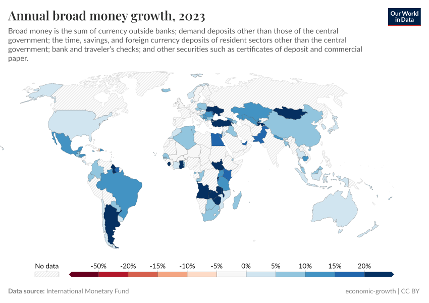 International Monetary Fund – processed by Our World in Data. “Annual broad money growth” [dataset]. International Monetary Fund, “International Monetary Fund, International Financial Statistics and data files.” [original data]. Retrieved May 8, 2025 from https://enhance-improve-who-empower.owid.pages.dev/grapher/annual-broad-money-growth