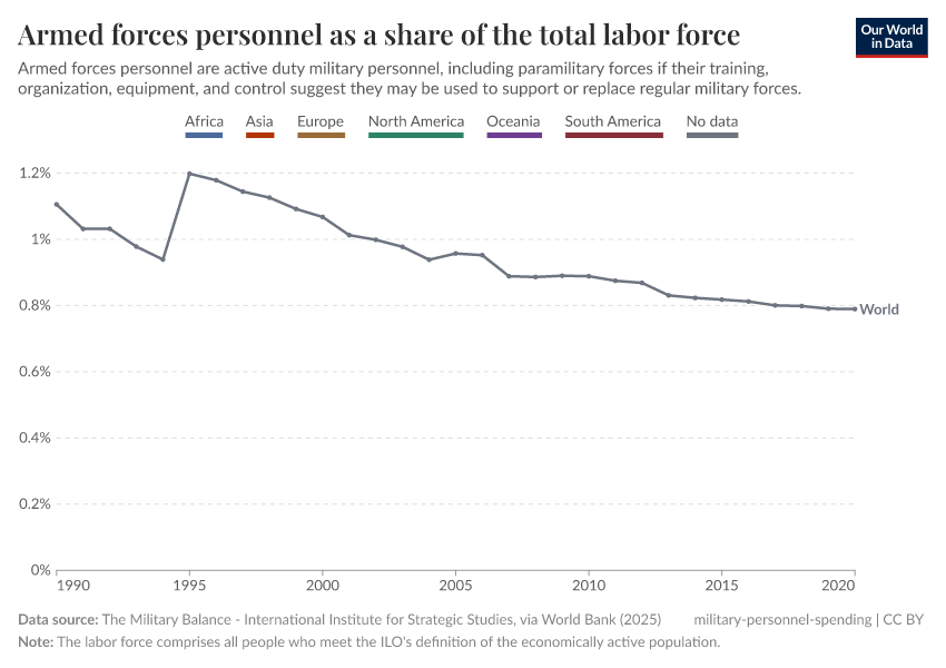 “Data Page: Armed forces personnel as a share of the total labor force”. Our World in Data (2025). Data adapted from International Institute for Strategic Studies (via World Bank). Retrieved from https://enhance-improve-who-empower.owid.pages.dev/grapher/armed-forces-personnel-of-total-labor-force [online resource]How to cite this data