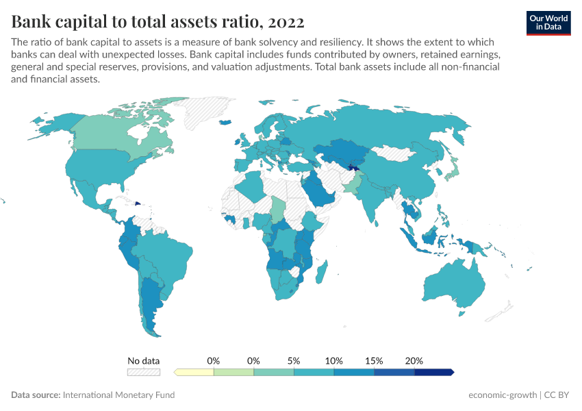 International Monetary Fund – processed by Our World in Data. “Bank capital to total assets ratio” [dataset]. International Monetary Fund, “International Monetary Fund, Financial Soundness Indicators.” [original data]. Retrieved May 8, 2025 from https://enhance-improve-who-empower.owid.pages.dev/grapher/bank-capital-to-total-assets-ratio