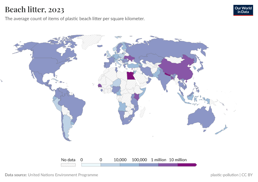 “Data Page: Beach litter”. Our World in Data (2025). Data adapted from United Nations Environment Programme. Retrieved from https://enhance-improve-who-empower.owid.pages.dev/grapher/beach-litter [online resource]How to cite this data