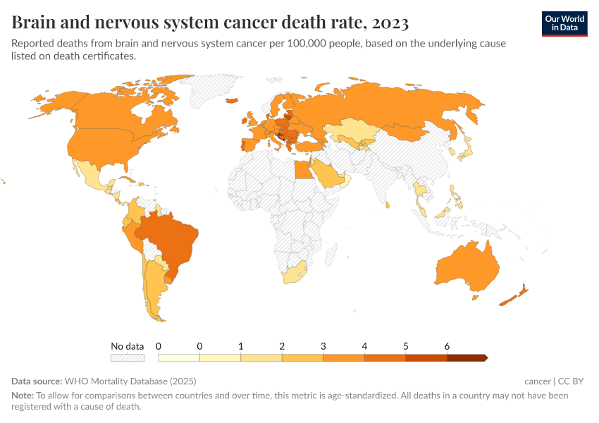 WHO Mortality Database (2024) – with minor processing by Our World in Data. “Brain and nervous system cancer death rate” [dataset]. WHO Mortality Database, “WHO Mortality Database” [original data]. Retrieved May 8, 2025 from https://enhance-improve-who-empower.owid.pages.dev/grapher/brain-and-nervous-system-cancer-death-rate