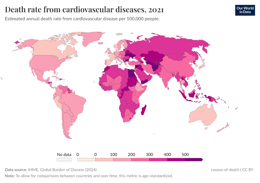 IHME, Global Burden of Disease (2024) – with minor processing by Our World in Data. “Death rate from cardiovascular diseases” [dataset]. IHME, Global Burden of Disease, “Global Burden of Disease - Deaths and DALYs” [original data]. Retrieved May 8, 2025 from https://enhance-improve-who-empower.owid.pages.dev/grapher/cardiovascular-disease-death-rates