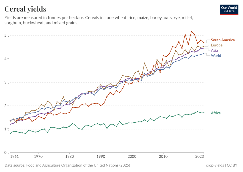 Food and Agriculture Organization of the United Nations (2025) – with major processing by Our World in Data. “Cereal yields – FAO” [dataset]. Food and Agriculture Organization of the United Nations, “Production: Crops and livestock products” [original data]. Retrieved May 8, 2025 from https://enhance-improve-who-empower.owid.pages.dev/grapher/cereal-yield