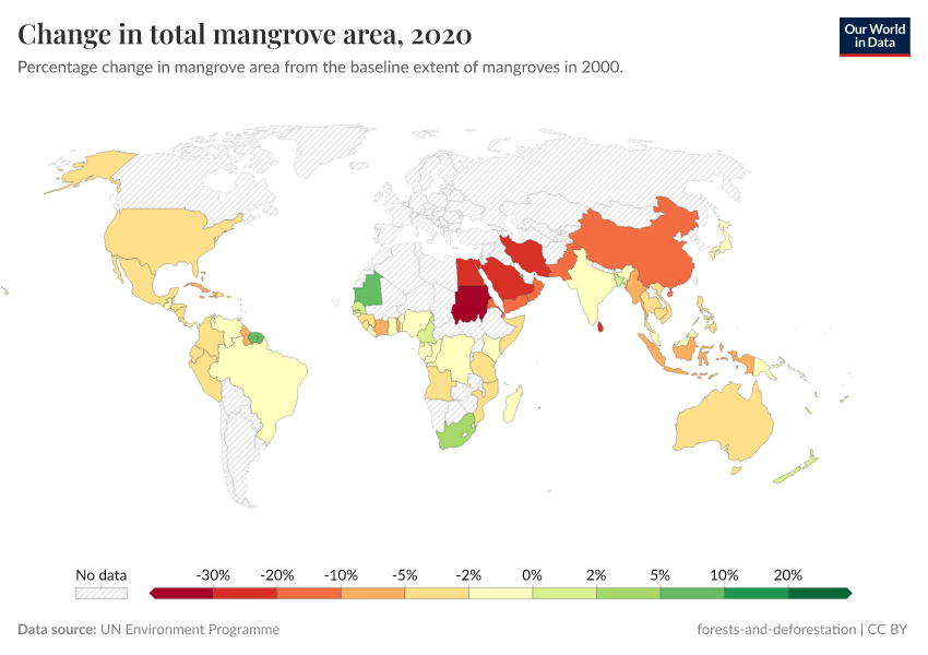 “Data Page: Change in total mangrove area”. Our World in Data (2025). Data adapted from UN Environment Programme. Retrieved from https://enhance-improve-who-empower.owid.pages.dev/grapher/change-in-total-mangrove-area [online resource]How to cite this data