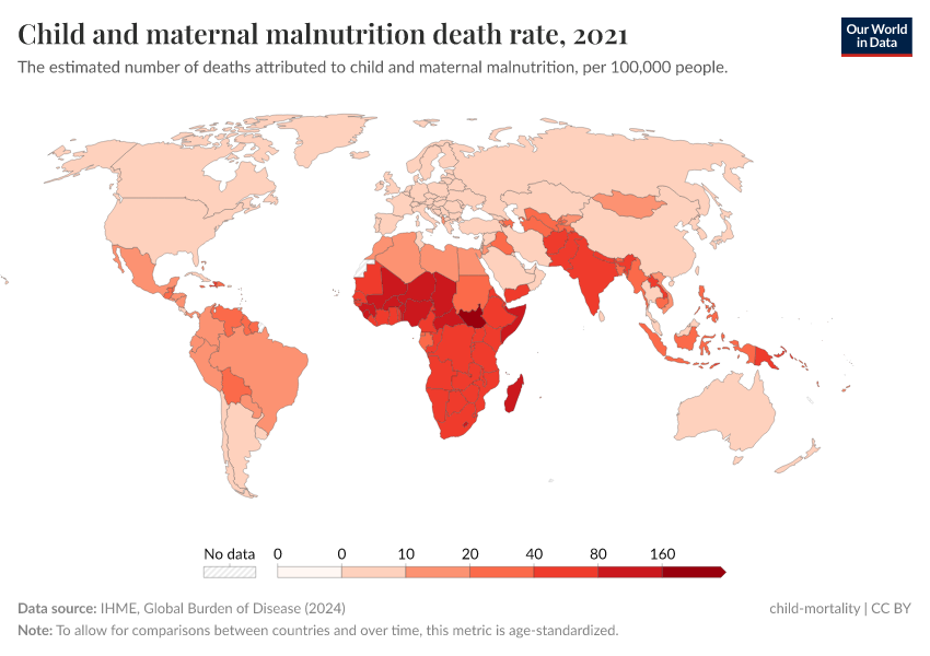 IHME, Global Burden of Disease (2024) – with minor processing by Our World in Data. “Child and maternal malnutrition death rate” [dataset]. IHME, Global Burden of Disease, “Global Burden of Disease - Risk Factors” [original data]. Retrieved May 8, 2025 from https://enhance-improve-who-empower.owid.pages.dev/grapher/child-and-maternal-malnutrition-death-rate