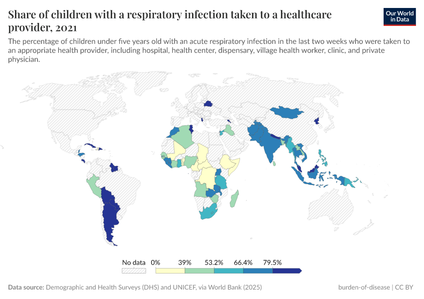 Demographic and Health Surveys (DHS) and UNICEF (via World Bank) (2025) – processed by Our World in Data. “Share of children with a respiratory infection taken to a healthcare provider ” [dataset]. Demographic and Health Surveys (DHS) and UNICEF (via World Bank), “World Development Indicators” [original data]. Retrieved May 8, 2025 from https://enhance-improve-who-empower.owid.pages.dev/grapher/children-treated-ari