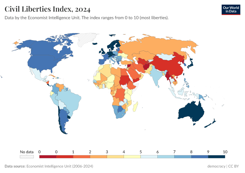 Economist Intelligence Unit (2006-2024) – processed by Our World in Data. “Civil liberties index” [dataset]. Economist Intelligence Unit, “Democracy Index 2021: The China challenge”; Economist Intelligence Unit, “Democracy Index 2022: Frontline democracy and the battle for Ukraine”; Economist Intelligence Unit, “Democracy Index 2023: Age of Conflict”; Economist Intelligence Unit, “Democracy Index 2024: What's wrong with representative democracy?”; Gapminder, “Democracy Index v4” [original data]. Retrieved May 8, 2025 from https://enhance-improve-who-empower.owid.pages.dev/grapher/civil-liberties-index-eiu