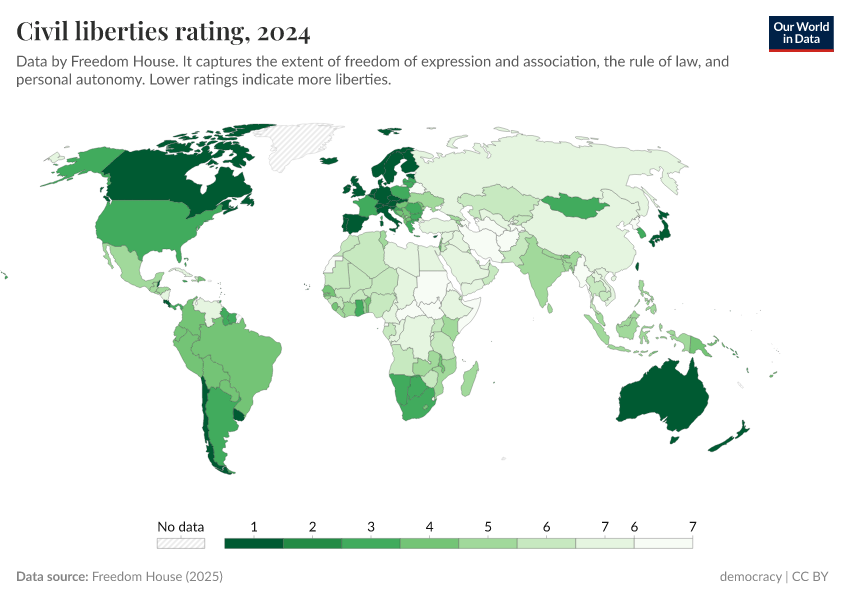 Freedom House (2024) – processed by Our World in Data. “Civil liberties rating” [dataset]. Freedom House, “Freedom in the World” [original data]. Retrieved May 8, 2025 from https://enhance-improve-who-empower.owid.pages.dev/grapher/civil-liberties-rating-fh