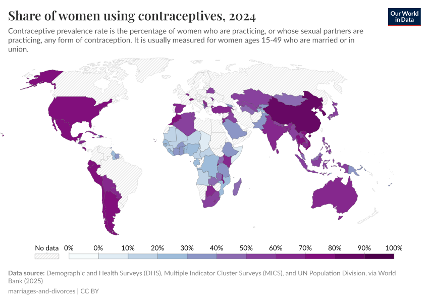 Data compiled from multiple sources by World Bank (2025) – processed by Our World in Data. “Share of women using contraceptives” [dataset]. Data compiled from multiple sources by World Bank, “World Development Indicators” [original data]. Retrieved May 8, 2025 from https://enhance-improve-who-empower.owid.pages.dev/grapher/contraceptive-prevalence-any-methods-of-women-ages-15-49