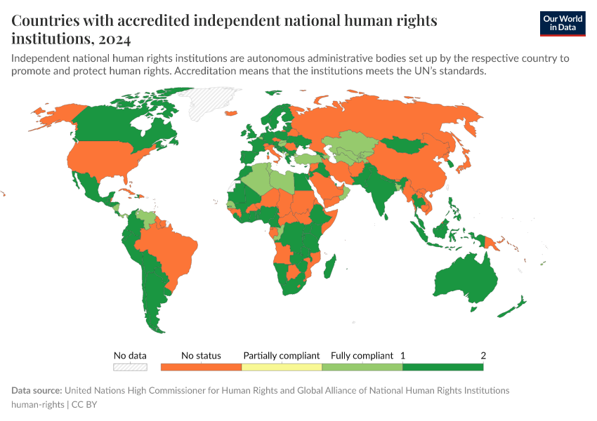 United Nations High Commissioner for Human Rights and Global Alliance of National Human Rights Institutions – processed by Our World in Data. “Countries with accredited independent national human rights institutions” [dataset]. United Nations High Commissioner for Human Rights and Global Alliance of National Human Rights Institutions, “Source: The Office of the United Nations High Commissioner for Human Rights (OHCHR) in collaboration with Global Alliance of National Human Rights Institutions (GANHRI).” [original data]. Retrieved May 8, 2025 from https://enhance-improve-who-empower.owid.pages.dev/grapher/countries-with-independent-national-human-rights-institution